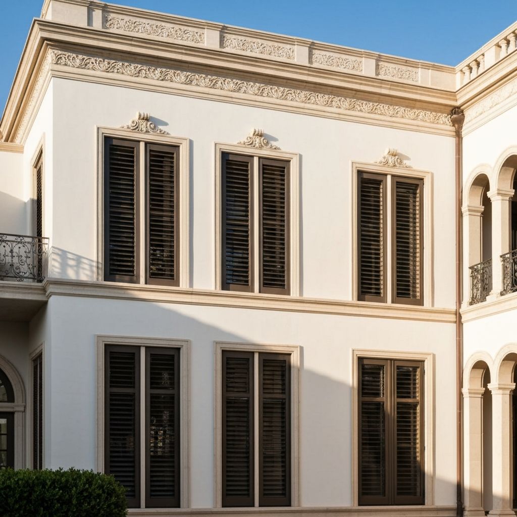 Contraventanas de lamas orientables que combinan protección solar y estética mediterránea.